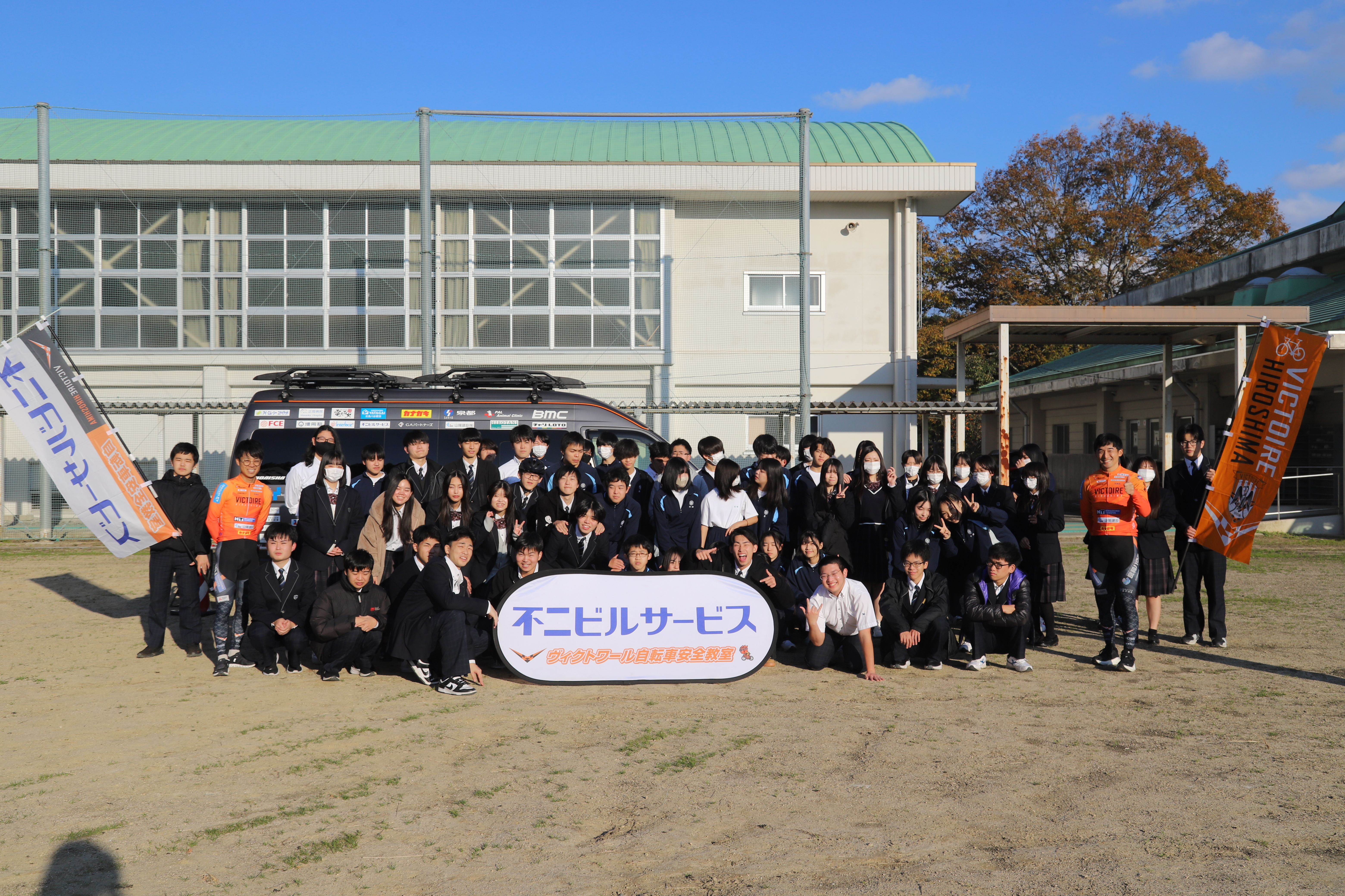 本日11/20(木)湯来南高等学校にてJAF(一般社団法人日本自動車連盟)が交通安全教室を開催、その中で自転車教室の講師を柴田選手と久保田選手が務めました!
