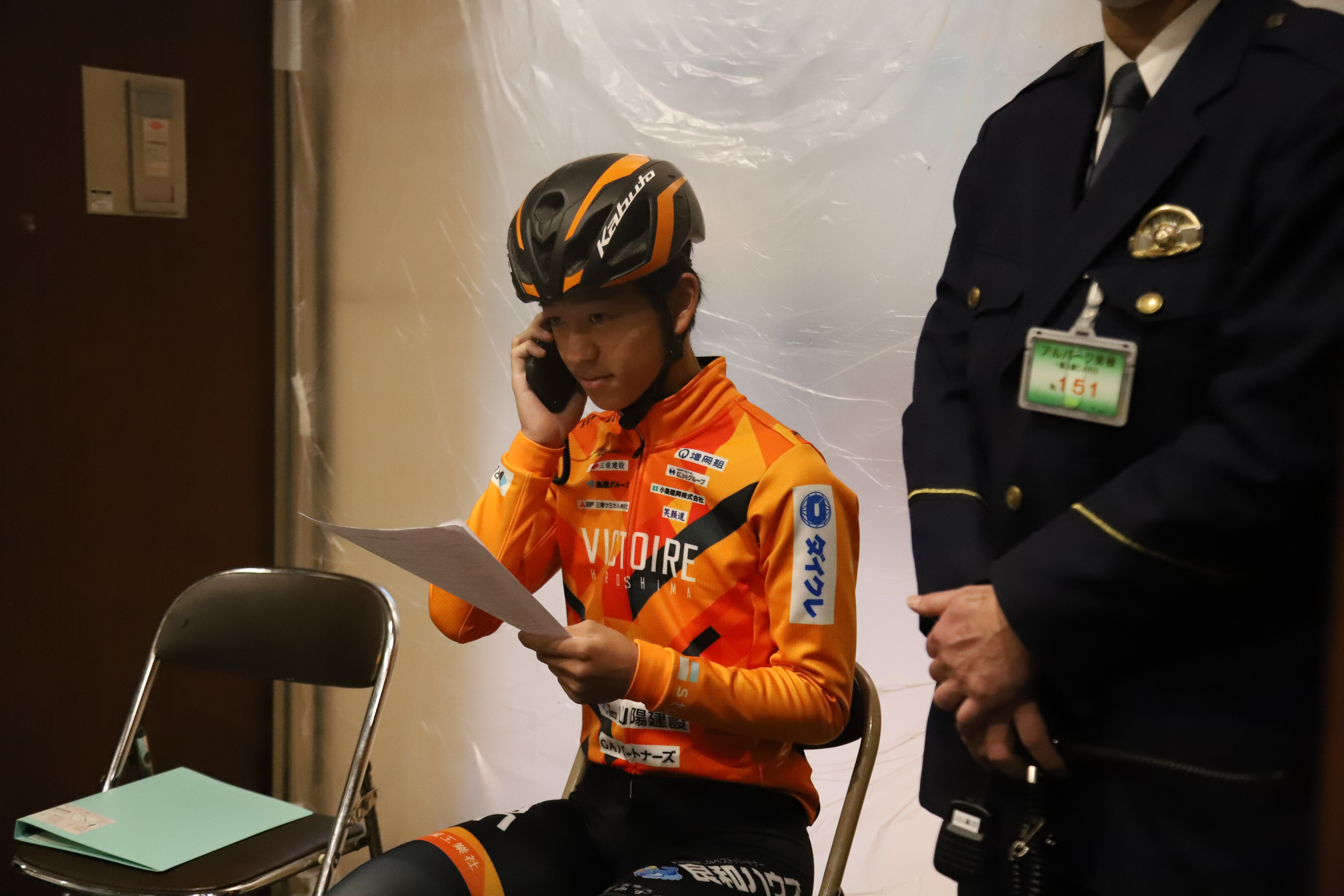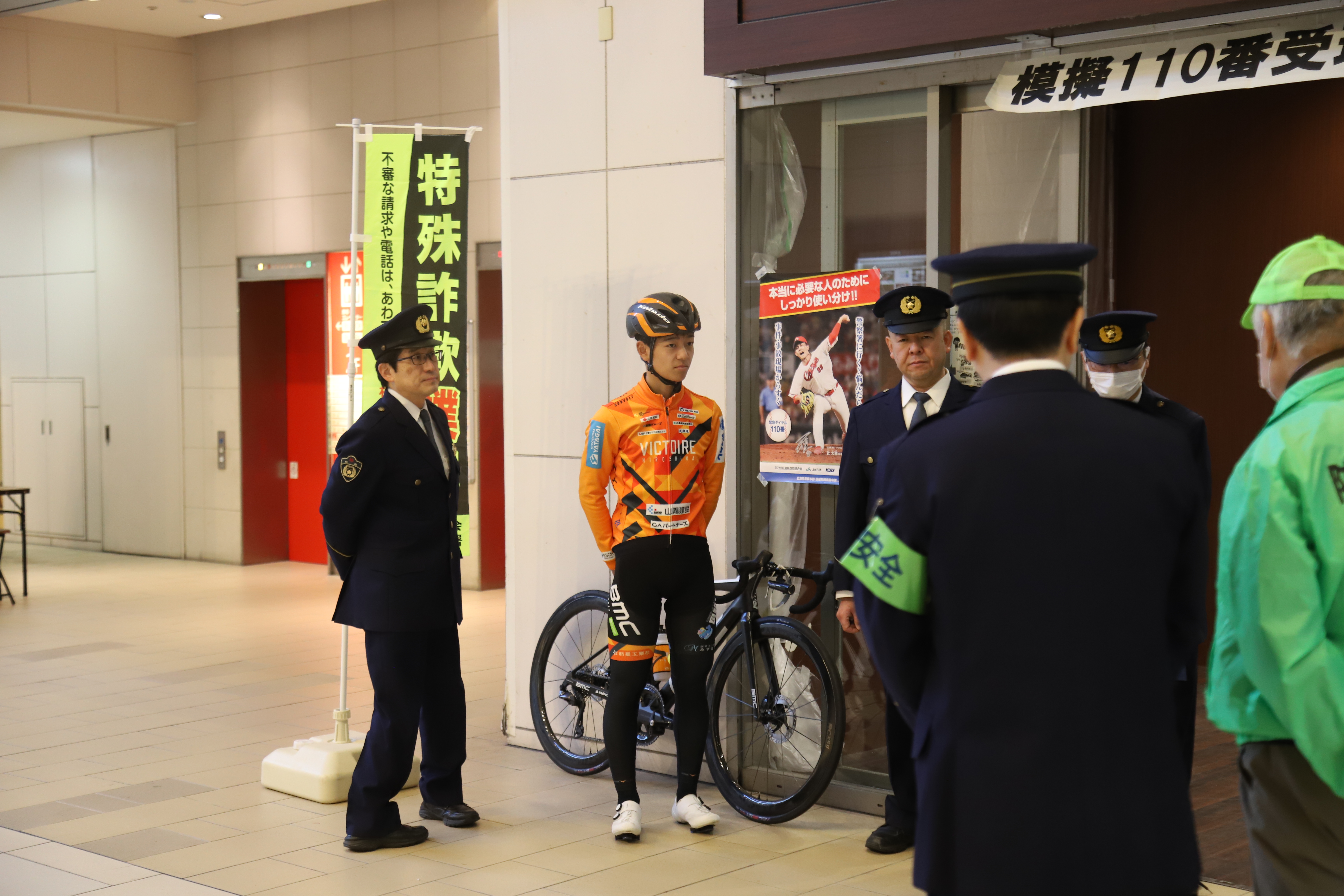 イベントでは模擬110番通報体験が行われ、中村選手は通報者役を担当。