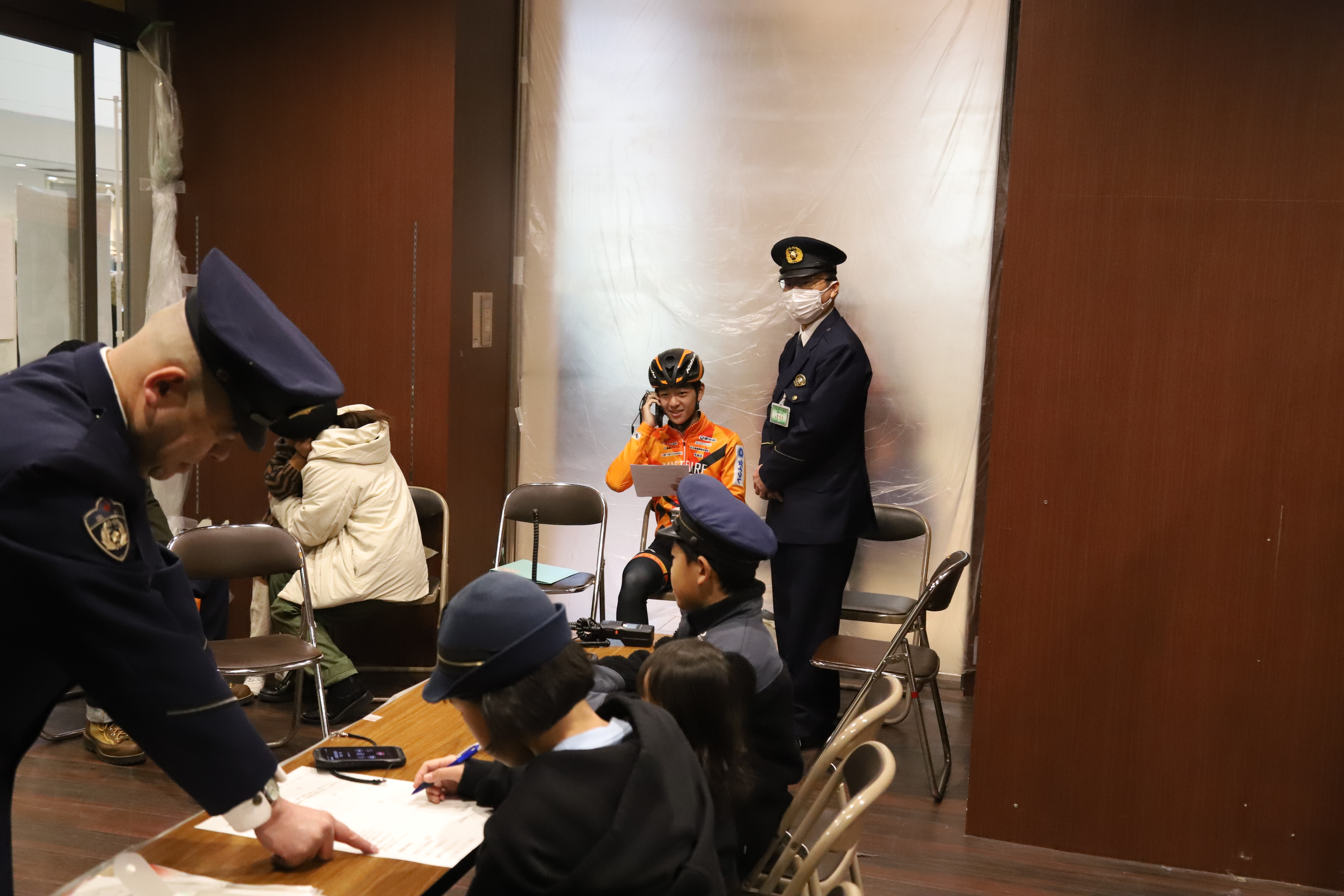司令担当の警察官役を務める子供達に、自転車盗難や交通事故を想定した模擬通報を行いました。