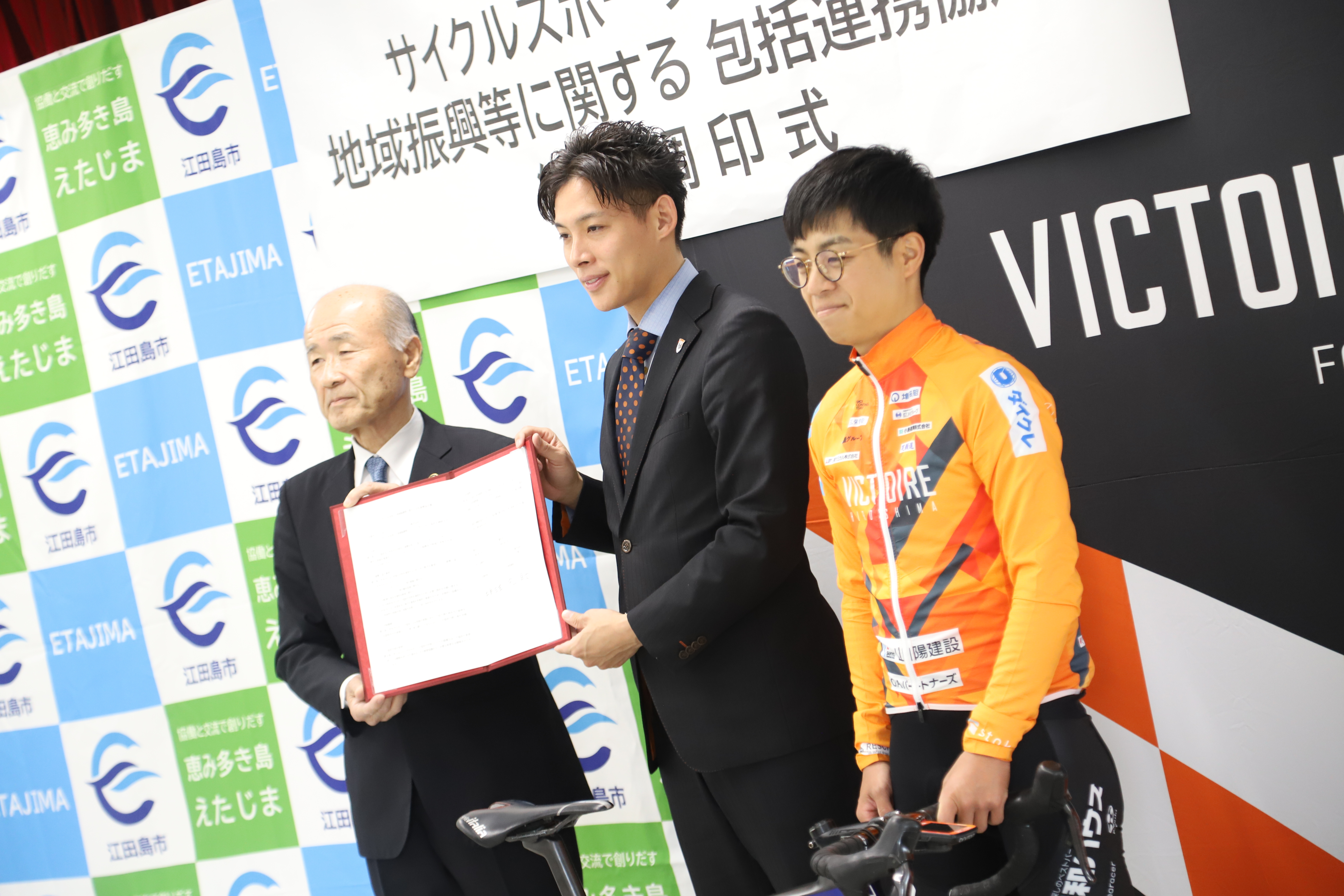 ヴィクトワール広島は江田島市(土手三生市長)と連携協定を結び、締結式に中山GMと久保田選手が出席しました。