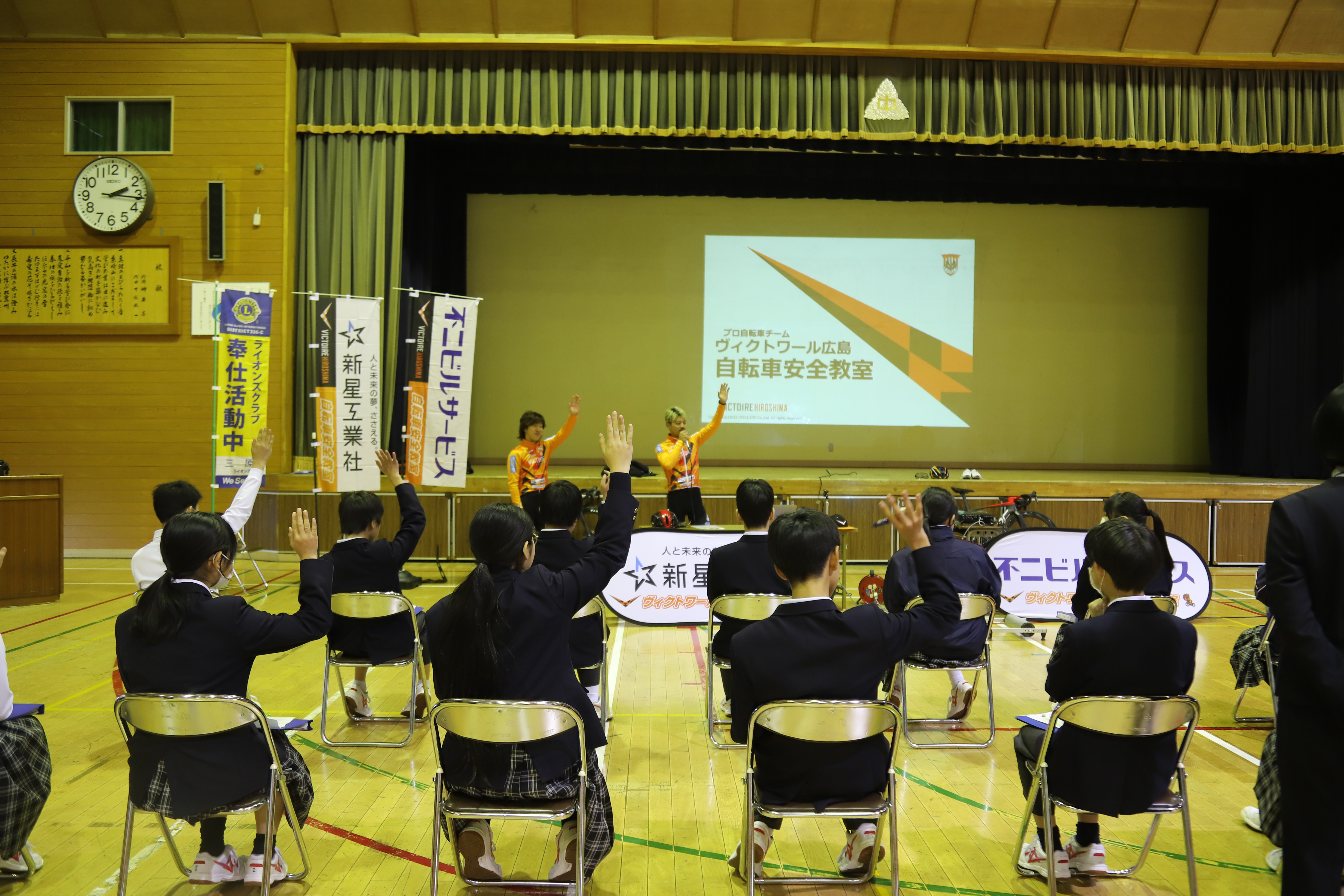 本日1/29(木)、三原市立第一中学校にて自転車安全教室を開催し、孫崎選手と中村選手が講師を務めました!