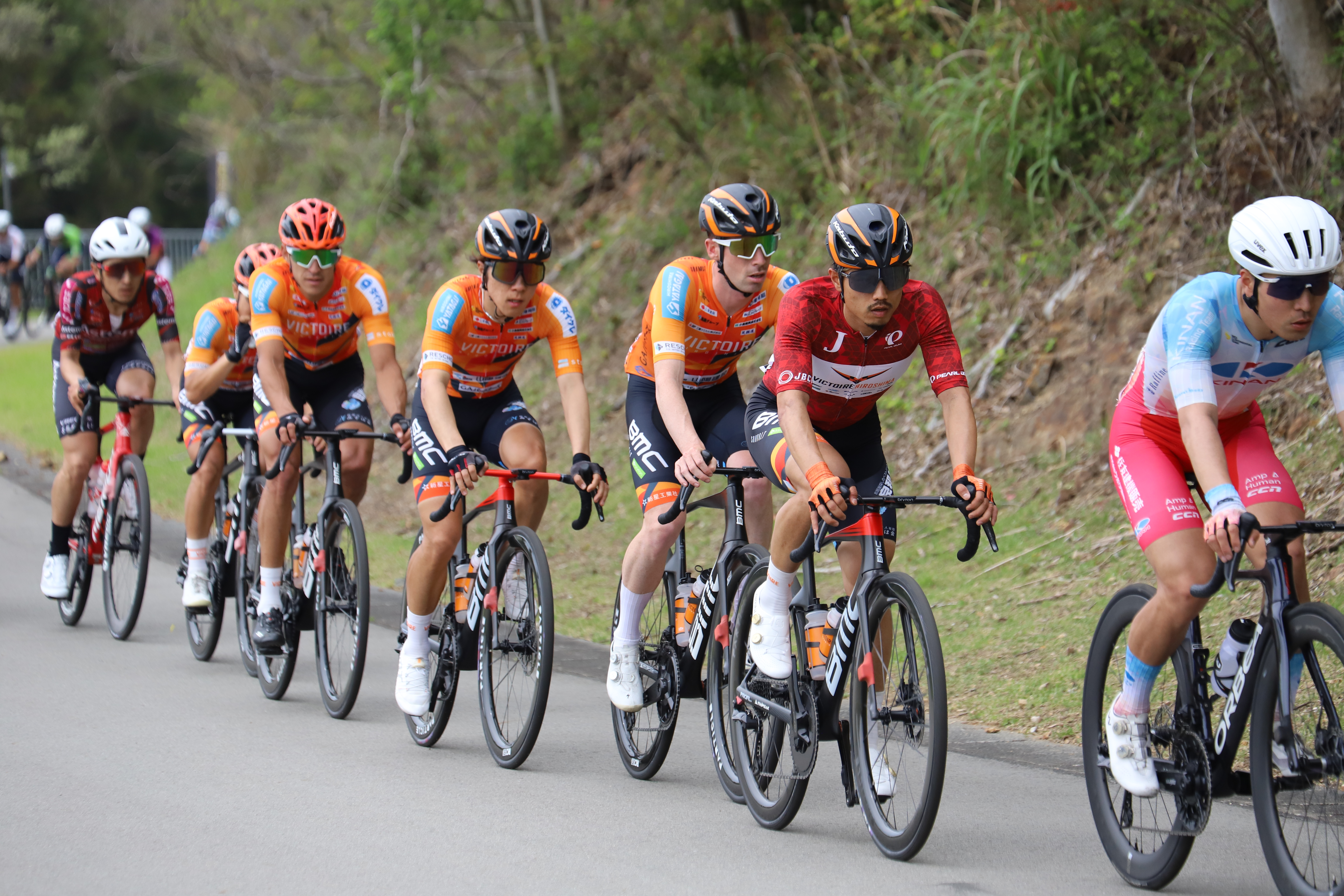 ラスト2周で全ての逃げを吸収すると、各チームのエース同士による激しいアタック合戦へ突入。ヴィクトワール広島もルークや孫崎を中心に積極的に攻撃を仕掛け、集団の人数を絞り込みますが、決定的な抜け出しには至りません。